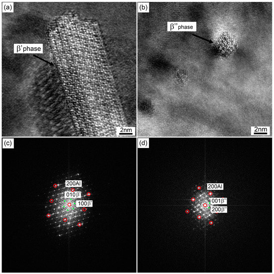 In recent years, Al–Mg–Si alloys have become the preferred material for use as automotive outer body sheets due to their high strength-to-weight ratio, good formability, high corrosion resistance, and attractive hardening potential after artificial aging [1,2,3,4]. For heat-treatable Al–Mg–Si alloys, precipitation hardening is the main strengthening mechanism utilized in processing. The precipitation sequence of Al–Mg–Si alloys is as follows [5,6,7,8]: SSSS → clusters/GP zones → pre-β″ → β″ → β′ → β, Si, where SSSS represents a supersaturated solid solution. The main strengthening precipitates are highly coherent GP zones with a large amount of needle-shaped β″ phase after the paint bake-hardening treatment (generally at 185 °C for 20–30 min) [5,9]. At peak aging period, the coarsened β″ phase is semicoherent with the matrix [8]. The post β′ phases are semicoherent rods and produce coarser precipitate microstructures with a lower strength contribution [10,11]. The equilibrium β phase, which is not coherent with the matrix, forms as plates with dimensions of several micrometers composed of Mg2Si [12]. The abovementioned precipitation structures and phases are closely related to both the alloy composition and the heat treatment process.