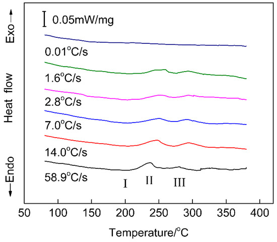 Differential scanning calorimetry (DSC) curves for samples with different quenching rates.