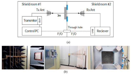 Shielding effectiveness measurement system. (a) System configuration, (b) Tx (Transmission) antenna, Rx (Receiving) antenna, and sample installation.