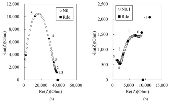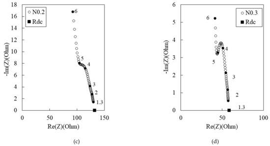 Figure 3 shows the experimental Nyquist plots for the 100 MPa HPFRCC with varying MWCNT contents: (a) 0%, (b) 0.1%, (c) 0.2%, and (d) 0.3%. The 100 MPa HPCC with 0.4% MWCNT could not be produced, because the addition of 0.4% MWCNT led to poor flowability of the HPFRCC. The N0 sample exhibits a single-arc behavior, and Rm (real impedance at the right-side cusp point between the single bulk arc and the electrode arc) is 38350 Ω. At 0.1% MWCNT, the dual arcs are more prominent, and Rcusp and Rrm decrease to 2233 and 8035 Ω, respectively. At 0.2% MWCNT, the dual-arc behavior is not clear; nevertheless, one of the dual arcs appears as a weak shoulder. As shown in Figure 3b–d, the dual arcs are observed because of the addition of MWCNTs despite the absence of steel fibers; Rcusp and Rrm both decrease with the increase in the MWCNT content.