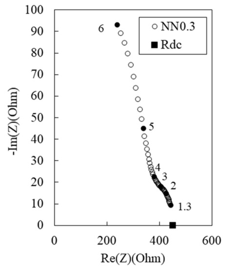 Figure 4 shows the Nyquist plot for the 100 MPa HPCC with 0.3% MWCNT of a shorter length. At the same MWCNT content, the use of MWCNTs with a longer length (Figure 3d) leads to a decrease in Rcusp and Rrm. This suggests that the longer length MWCNTs are beneficial for the formation of a percolation path.