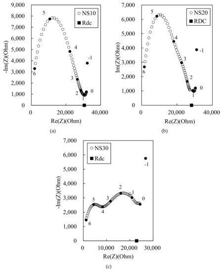 Figure 5 shows the Nyquist plots for the 100 MPa HPFRCC, where 10%, 20%, and 30% of the mix water are replaced by the MWCNT liquid solution. The effect of MWCNT liquid solution on the impedance is little compared with that of the powder MWCNT. Only the SN30 sample shows visible dual-arc behavior, whereas no distinct two cusp points can be observed in the SN10 and SN20 samples. This is probably due to the poor dispersion of the MWCNTs in the cement matrix when using the MWCNT liquid solution. Another reason is that the higher amount of surfactant in the MWCNT liquid solution can lead to the formation of air voids during the manufacturing process, disturbing the percolation path. The increase in the air voids can be confirmed from the MIP results in Section 3.4.