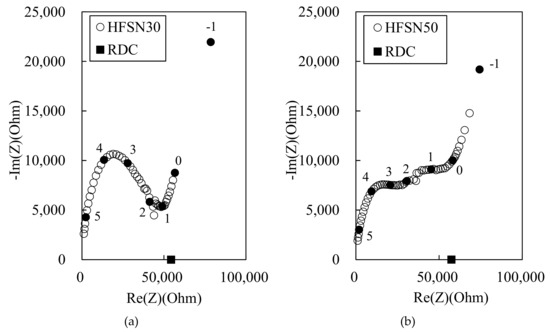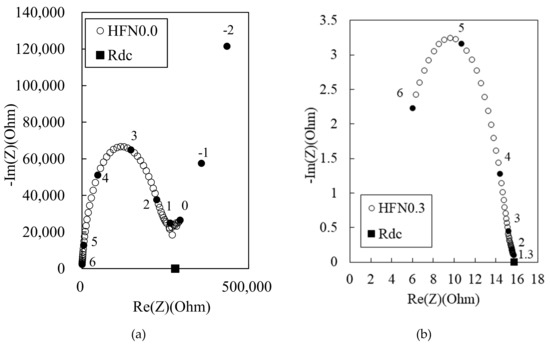 Figure 6 shows the Nyquist plots for the 100 MPa HPFRCC containing steel fibers. In Figure 6a, Rcusp at high frequency can be observed, but it is difficult to distinguish Rcusp at low frequencies and the electrode arc in the HPFRCC with steel fibers. This behavior has been previously reported [3]. Nevertheless, given that Rcusp at low frequency (corresponding to the impedance of the reinforced composite) coincides with RDC(rm) (the four-point DC resistance of the reinforced composite) in conductive fiber/cement composites [3,4,10], we can find the positions of Rcusp at high frequency, Rcusp at low frequency, and RDC from the Nyquist plots of the HPFRCC. At 0.3% MWCNT and 2.0% steel fiber (Figure 6b), the dual arcs can be observed, and Rcusp at high frequency and Rrm are significantly decreased, compared with those of HPFRCCs with 0% MWCNT and 2.0% steel fiber.