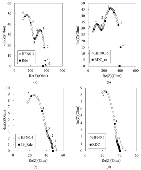 Experimental Nyquist plots for 100 MPa HPFRCC with (a) 0%, (b) 0.1%, (c) 0.2%, and (d) 0.3% multi-walled carbon nanotubes (MWCNTs) (length: 100–200 μm, diameter: 6–9 nm) (Frequency markers are shown as darkened points with the numbers corresponding to the log of frequencies in Hz).