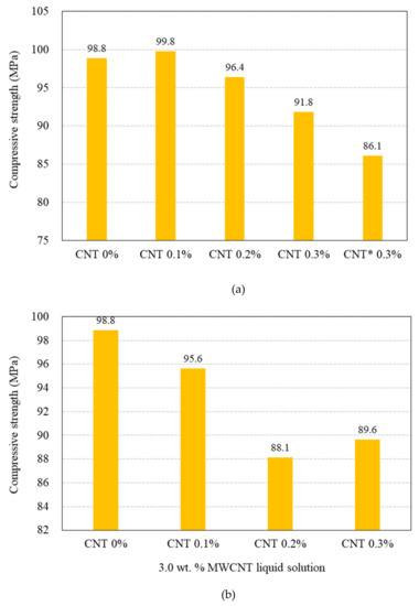 The use of the liquid-type MWCNT solution resulted in a greater decrease in the compressive strength of the 100 MPa HPFRCC without the steel fibers (Figure 11b). At a MWCNT content of 0.1%, the compressive strengths of the powder-type MWCNT sample and the liquid-type MWCNT sample are 99.8 and 95.6 MPa, respectively; at a MWCNT content of 0.3%, the values are 91.8 and 89.6 MPa.