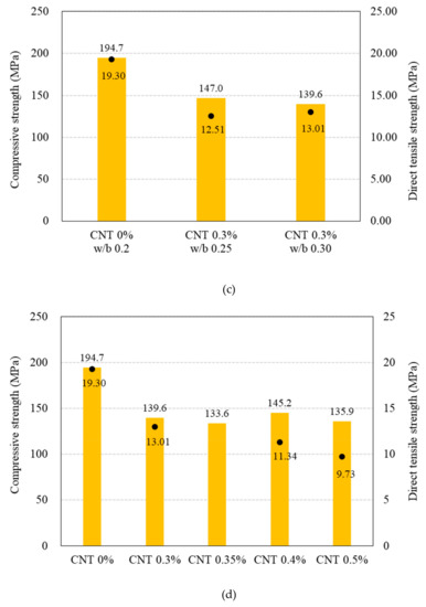 Figure 11 shows the compressive and direct tensile strengths of the 100 and 180 MPa HPFRCCs with and without steel fibers. As shown in Figure 11a, the compressive strength of the 100 MPa HPFRCC without the steel fibers at 0.1% MWCNT is slightly greater than that at 0% MWCNT; it then decreases with increasing MWCNT content (%). The compressive strength of the sample (CNT* 0.3%) with shorter length MWCNTs (50–150 μm) is remarkably lower than that of the 0.3% CNT sample.