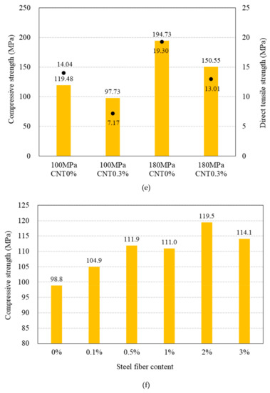 Compressive strength and direct tensile strength results for 100 MPa and 180 MPa-HPFRCC w/wo steel fibers. (a) Use of powder-type MWCNT in 100 MPa-HPFRCC without steel fiber; (b) use of liquid-type MWCNT solution in 100 MPa-HPFRCC without steel fiber; (c) use of powder-type MWCNT in 180 MPa-HPFRCC with 2.0% steel fiber; (d) use of powder-type MWCNT in 180 MPa-HPFRCC with 2.0% steel fiber; (e) use of liquid-type MWCNT in HPFRCC with 2.0% steel fiber; (f) steel fiber contents in 100 MPa-HPFRCC. * MWCNT used in 0.3% CNT* sample had a length in the range of 50–150 μm, which is shorter than that (100–200 μm) of MWCNTs used in the other samples.