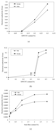 where, R is the resistance (Ω); A is the area of contact between the material and the electrodes (cm2); L is the distance between the electrodes (cm); and is the electrical conductivity (S/cm). In Figure 12, σ(com), σ(mat), and σ(r-mat) denote the electrical conductivities of the composites (matrix + steel fiber), unreinforced matrix, and MWCNT-reinforced matrix (matrix + MWCNT), respectively.