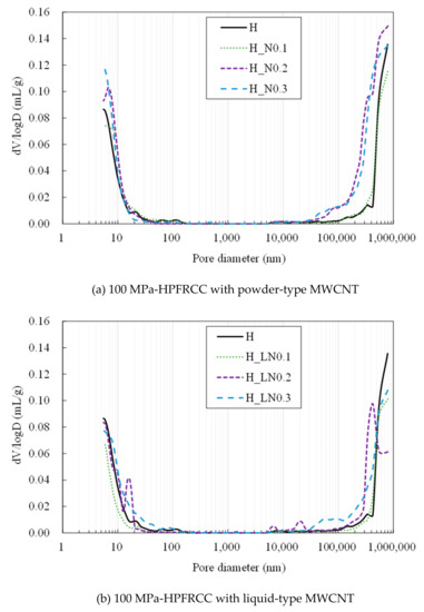 Figure 13 shows the pore size distribution of the HPFRCC measured using MIP. As listed in Table 5, the volume of the pores with a diameter below 100 nm does not vary regardless of the amount of MWCNTs, whereas the volume of the pores with a diameter above 100 μm increases with the amount of MWCNTs. The increased pore volume is strongly associated with the flowability of the fresh HPFRCC. The flowability decreases with the increase in the MWCNT content, as listed in Table 4. The reduced flowability leads to a poor self-filling property of the HPFRCC, consequently leading to a higher volume of macro pores. Similarly, the use of liquid-type MWCNTs resulted in a higher volume of pores with a diameter of 100 μm because of the reduced flowability. For the 180 MPa HPFRCC, the incorporation of MWCNTs did not decrease the flowability, as the w/b ratio of the 180 MPa HPFRCC with MWCNTs is 0.30, which is higher than that (0.20) of plain HPFRCC without MWCNTs.