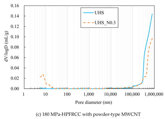 Pore size distributions of 100 MPa and 180 MPa-HPFRCC without steel fiber measured by MIP. (a) 100 MPa-HPFRCC with powder-type MWCNT; (b) 100 MPa-HPFRCC with liquid-type MWCNT; (c) 180 MPa-HPFRCC with powder-type MWCNT.