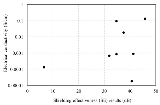 Figure 16 shows that there is no direct relationship between the electrical conductivity and the SE results of the HPFRCC. In particular, the use of steel fibers could not provide any meaningful information between the electrical conductivity and the SE results. At the micro level, the incorporation of steel fibers did not result in an electrical percolation path in the HPFRCC (See Figure 11c); therefore, the electrical conductivity could not be increased. At the macro level, the proper dispersion of the steel fibers into the HPFRCC helped reflect and absorb the electromagnetic waves, increasing the electromagnetic SE. To emphasize the findings once again, although there was no electrical percolation path in the HPFRCC, a high electromagnetic SE could be achieved. The electrical conductivity of the HPFRCC with 2.0% steel fiber content was 0.00086 S/cm, and the SE values were 45.8 dB (horizontal) and 42.1 dB (vertical) at 1 GHz. Despite the electrical conductivity of the HPFRCC being as low as 10−5 S/cm, the SE value was as high as 40 dB. The formation of the electrical percolation path with the addition of MWCNTs had a positive effect on the increase in the electromagnetic SE. The electrical conductivity of the HPFRCC with 0.3% MWCNT content was 0.093 S/cm, which was high enough to form a percolation path, and the SE values were 34.7 dB (horizontal) and 39.2 dB (vertical) at 1 GHz.