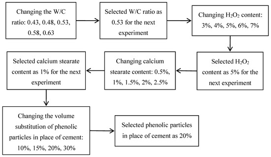 According to the foamed concrete proportioning design of Figure 1, the procedure of sample preparation is described as follows. (1) All raw materials were weighed accurately, then the cement and other powders were poured into a mixer. (2) Stirring the materials for 120 s at the speed of 140 ± 5 r/min to obtain the powder mixture. (3) After adding water, the cement pastes were obtained by stirring 120 s at speed of 285 ± 10 r/min with a mixer, and then adding H2O2, continually stirring the mixed material pastes for 120 s at the speed of 285 ± 10 r/min, the foamed cement pastes were obtained. (4) The foamed cement slurry was immediately poured into molds. The exposed top surface was covered with polyethylene film to prevent the water evaporation. (5) They were placed in a standard curing room, and, after 1 d, the foamed concrete was demoulded and then cured under standard condition (20 ± 1 °C, RH ≥ 95%).