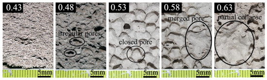 Figure 1 shows the surface morphology of foamed sulphoaluminate cement-based composites with varying water–cement ratios which were obtained by a digital camera (Canon: EOS 600D). It can be apparently observed that the amount of mixing water resulted in enormous effects on pore property of foamed composites. When the W/C ratio was 0.43, normal foaming is not possible. When a relative lower W/C ratio of 0.48 was used, irregular fine pores were embedded into cement samples. With the increase in the mixing water, in general the shape of pores tends to performance as a sphere, and the size of pores grows larger and larger. For the samples with a W/C ratio of 0.53, foamed composites were found to be involved with well distributed bubbles with a larger size than that of a W/C ratio of 0.48, the maximum diameter of the pores was 5 mm. Distinctive pore structure was discovered in those samples with W/C ratios of 0.58 and 0.63, more merged pores lead to poor cement structure which is mainly caused by the combination of large pores, as demonstrated in Figure 2, the maximum pore size was approximately 15 mm. The reasons for different pore structures were associated with the viscosity of the cement pastes which affects the foaming ability of H2O2. The viscosity property of the pastes was closely related to the fluidity behavior, and the relationship between the fluidity of the pastes and W/C ratio is presented in Figure 3. It can be seen that the fluidity of the cement pastes increase with W/C ratio, indicating that the viscosity of the pastes decreases with W/C ratio. However, it should be noted that an appropriate viscosity is needed to make foamed concrete. When the W/C ratio was less than 0.53, the cement pastes had a relatively small fluidity and large viscosity, the gas expansion force cannot break through the resistance from the cement pastes, resulting in a poor pore structure in Figure 2. When W/C ratios were greater than 0.53, the fluidity of the cement pastes is too large, meaning that the pastes cannot wrap the gas and the pores merge with each other. Therefore, the proper fluidity can make the O2 produced by decomposition of H2O2 expand normally in the cement pastes to produce pores with even size and distribution. In this study the best W/C ratio would be 0.53, based on Figure 2.