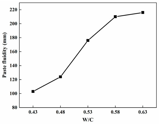 Cement pastes were prepared with various water/cement ratios (W/C = 0.43, 0.48, 0.53, 0.58, 0.63). The initial fluidity was measured with a truncated cone mold (height: 60 mm; top diameter: 36 mm; bottom diameter: 60 mm) in accordance with the Chinese standard of GB/T 8077-2012. The truncated cone placed on a glassy plate was filled with fresh pastes, which then was lifted upward. Allow the fresh pastes flows freely for 30 s, then the maximum diameter of the spread sample and the maximum width perpendicular to that diameter were measured. The average of these two results was defined as the fluidity value.