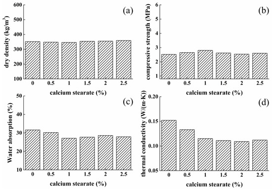 Effect of calcium stearate content on properties of foamed concrete: (a) dry density; (b) compressive strength; (c) water absorption; (d) thermal conductivity.