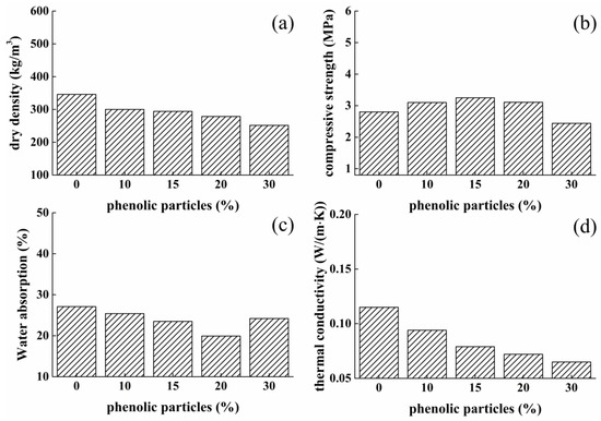 Effect of phenolic particles content on properties of foamed concrete: (a) dry density; (b) compressive strength; (c) water absorption; (d) thermal conductivity.