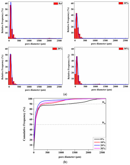 Pore size analysis: (a) pore size distributions of the foamed concretes; (b) cumulative frequency distributions of pore size.