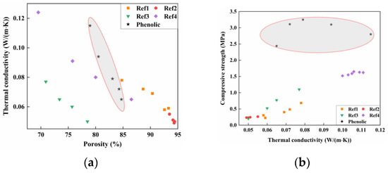 Mechanism analysis of phenolic-foamed concrete: (a) the relationship between porosity and thermal conductivity; (b) the relationship between thermal conductivity and compressive strength.