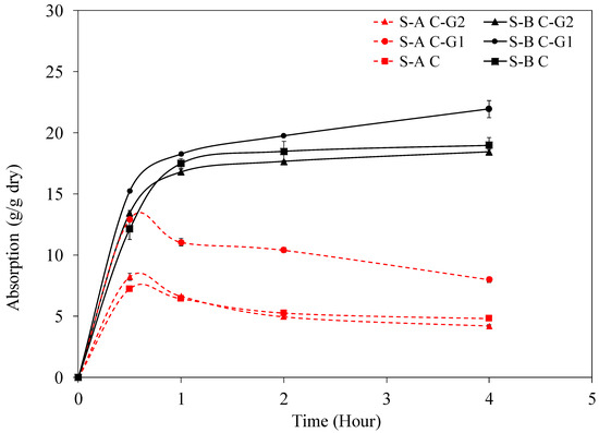The absorption behavior of the two SAPs with different chemical compositions, S-A and S-B, in different slurries—C, C-G1, and C-G2—is illustrated in Figure 1. As detailed in the Experimental section, C, C-G1, and C-G2 slurries refer to the slurries made of neat cement and cement with glass powders G1 and G2, respectively. The data corresponding to S-A C and S-B C are reproduced from [81]. Note that S-A and S-B showed a significantly lower absorption in slurries compared to their absorption in distilled water, which was approximately 130 (g/g) and 85 (g/g), respectively. The absorption measurement in distilled water was conducted using SAP powder. The lower absorption in slurries is due to the presence of cations, such as Na+, K+, and Ca2+, in the slurries [30,68,71]. These cations are released into the slurries because of solid binder particle dissolution. In the presence of these cations, repulsive forces between negatively charged carboxylate groups in the SAP network are reduced through the screening effect; additionally, divalent cations, such as Ca2+, can form complexes with the negatively charged carboxylate groups. The screening effect and complex formation lead to a reduction in the swelling of the SAPs [30,68,71]. Unlike in distilled water, S-A exhibited a lower absorption compared to S-B in slurries, which could be attributed to a higher concentration of carboxylate groups from acrylic acid in S-A than in S-B, which provides more screening effect and complexation. Note that the absorption of SAPs in C-G1 slurry is more than in C and C-G2 slurries, and the difference is more pronounced in S-A than S-B, as seen from Figure 1.