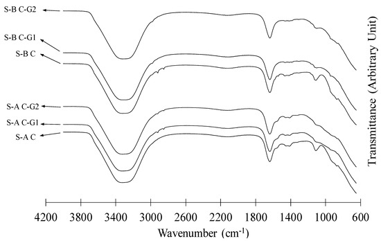 The FTIR spectra of SAPs after absorption in different slurries, C, C-G1, and C-G2 are depicted in Figure 2. The data corresponding to S-A C and S-B C are reproduced from data in [81]. The spectra of SAPs exhibited similar features: the peak at 1638 cm−1 [87] is attributed to amide groups, and the peaks at 1560 cm−1 and 1408 cm−1 are associated with carboxylate groups [30,74,88]. A broad peak at about 3300 cm−1 is assigned to the O–H bond of free water in the SAPs [89]. However, a distinguishing feature can be noticed in peaks at approximately 1110 cm−1 and 874 cm−1, which correspond to the carbonate groups. These peaks appear to be stronger in both S-A and S-B after absorption in C slurry than in C-G1 and C-G2 slurries. The stronger peaks could indicate a more pronounced formation of carbonate compounds more likely calcium carbonate on the surface of the SAPs. Calcium carbonate is most likely a product of the carbonation of complexes involving Ca2+ and anionic groups of the SAP polymeric network. The formation of a whitish thin layer on the surface of SAPs has previously been noted in other studies [22,90].