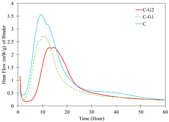The hydration heat flow of the cement paste and the pastes with G1 and G2 with a 40% replacement rate obtained from isothermal calorimetry is demonstrated in Figure 3. All pastes showed a first peak at the very beginning corresponding to the dissolution stage of hydration. A second peak associated with the binding phase formation in the microstructure is seen in all pastes. This peak is higher in C paste than in C-G1 and C-G2 pastes. This can be attributed to the dilution effect as a result of cement replacement with glass powders. The peak in C-G1 paste seems to be slightly higher than that of C-G2 paste. A delay in the peak in C-G2 paste compared to C and C-G1 pastes is noticed indicating a slower hydration in C-G2 paste compared to the other two pastes.