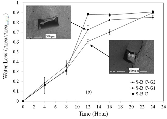 Water loss of (a) S-A and (b) S-B embedded in different pastes. Micrographs of embedded SAPs at the age of 12 h in C-G1 and C-G2 pastes are presented.