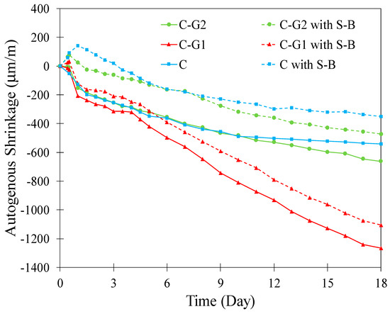 The autogenous shrinkage of different pastes with and without S-B is shown in Figure 6. All pastes without SAPs showed a similar shrinkage up to 5 days; however, after this age, there is a sharp increase in shrinkage in C-G1 paste compared to C paste. In the case of C-G2 paste, an increase in shrinkage occurred at a later age (10 days) compared to C paste. The observed shrinkage in paste with glass powders could be due to the pozzolanic reaction, which is not active at early age and becomes active after formation of Ca(OH)2. The pozzolanic reaction contributes to microstructure densification, and as a result, increases the capillary forces and autogenous shrinkage in the pastes [62]. Pastes with S-B showed a general reduction in shrinkage compared to pastes without S-B; however, this reduction was smaller in the paste with G2 and more notably in the paste with G1, compared to the neat cement paste. Additionally, note that the autogenous shrinkage curves of each paste with and without S-B followed a parallel trend as seen from Figure 6. A small expansion after the setting time in C with S-B is observed; such expansions have also been documented in prior studies. Reabsorption of bleeding water and crystallization pressure of Ca(OH)2 formation have been suggested as possible reasons for this expansion [36,62,91].