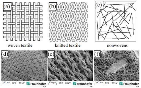 Schematic drawings above of: (a) woven; (b) knitted and (c) nonwoven fabrics and SEM images below of: (d) woven; (e) knitted and (f) nonwoven fabrics.