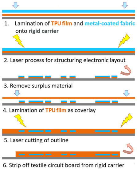 For electrical insulation and protection against external agents, the conductor tracks are embedded in a matrix of TPU. Figure 2 illustrates the developed process flow in the manufacturing of stretchable circuit boards made of textiles and elastomer films.