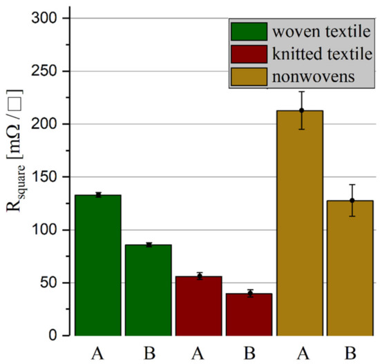 The sheet resistance is used to compare the electrical resistances of two-dimensional conductors with different width and lengths, such as electrically conductive fabrics. It is calculated from the measured resistance and the quotient of conductor width and length (. The sheet resistances of the individual fabrics in different stages of processing are shown in Figure 5. The starting sheet resistances of the textile structures before lamination (without heat and pressure influence, marked with A) are compared to the resistances of the textile structures after lamination (with heat and pressure influence, for sheet resistance measurement without embedding in TPU, marked with B).