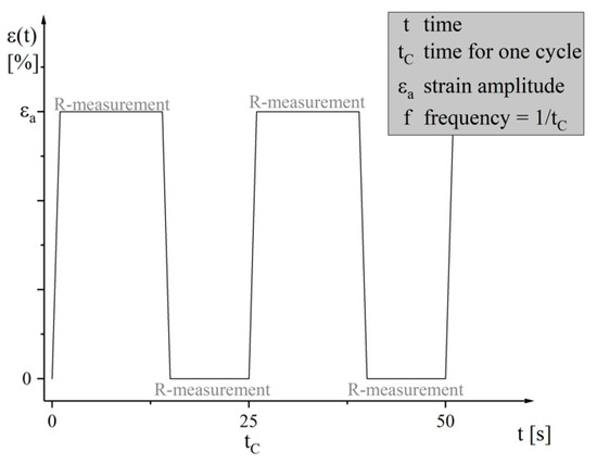The cyclic mechanical load, which acts on the stretchable circuit boards in many dynamic applications, is simulated by repeated uniaxial loading and relaxation. In order to characterize the change of the electrical behavior during the cyclic mechanical load test, the stretch tester developed and described by Born [19] is used. This measures the initial resistance of the clamped samples, pulls them to a preset stretch, further measures the electrical resistance in the stretched state, and then returns to the home position to measure the electrical resistance again. The stretch tester repeats these cycles until the conductor breaks or the test is terminated manually. The boundary conditions during these cyclic mechanical load tests are listed in Table 3 and Figure 6, the time-progress of the strain-controlled cyclic tests is shown.