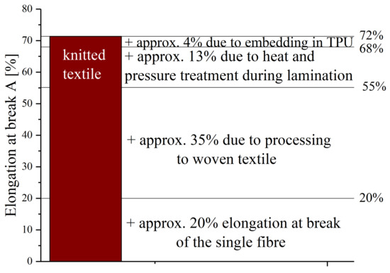 As expected, the elongation at break of the threads (A = 20%, [5]) is lower than those of the textile structures. The increased stretchability is attributable to, inter alia, the processing into fabrics. The tensile load of the fabrics is partly modified by the fact that the thread intersections strengthen under bending loads, so that a higher elasticity is achieved. In addition to processing into fabrics, the threads are also subjected to heat and pressure during lamination in TPU. In order to find out what influences the individual process steps have on the samples, further tests are conducted. Figure 8 illustrates the elongation at break point of all steps during processing, exemplary for samples made of knitted textiles.