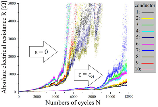 With cyclic mechanical loading of the samples, no classical conductor break was observed, but no or only a very late electrical failure occurred. Experiments demonstrate that the cyclic load at silver-plated fabrics causes a resistance increase up to 10,000 times the initial value, whereby significant differences between loaded and unloaded measurements can be seen. The improved conductance in loaded measurements could be due to the increased number of contact points due to cross-sectional contraction (see Figure 9).