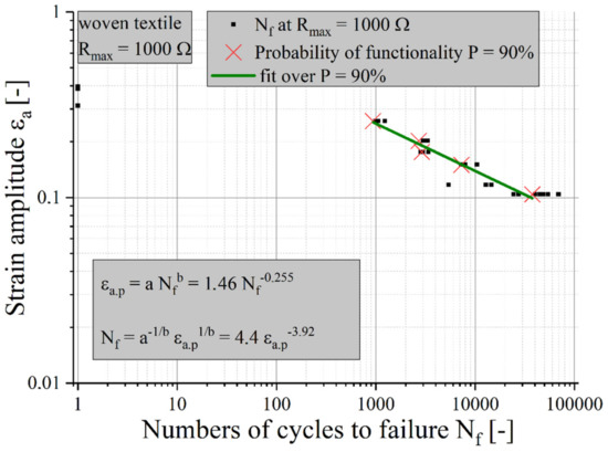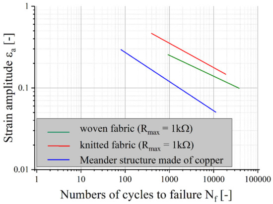 The results of the Coffin–Manson equations for samples with textile structures with the failure criterion of Rmax = 1 kΩ are shown in Figure 11. To compare the lifetime, the life expectancy of a sample with meandering copper tracks is added [26].