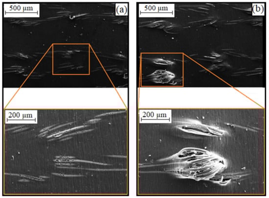 SEM-image of a cut with a focused ion beam (FIB) on a thermally: (a) untreated; (b) tempered silver-plated PA 6.6 [18].