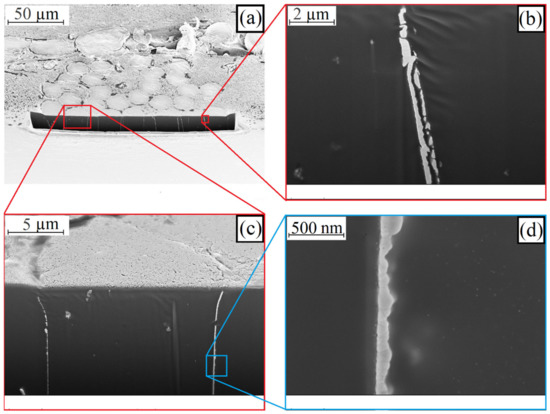 SEM image of a FIB cut on a tested sample with conductors made of knitted textiles at magnification of: (a) 1000×; (b) 20,000×; (c) 50,000× and (d) 40,000×.