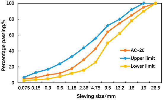 According to the Marshall mix design method based on the Chinese specifications [26], a dense-graded asphalt mixture, AC-20, was prepared in the laboratory. Aggregate gradation with a nominal maximum aggregate size of 19 mm is shown in Figure 1. Based on the Marshall mix design method, the volumetric properties of the AC-20 asphalt mixture were determined as shown in Table 1. Aggregates smaller than 2.36 mm, mineral filler, and asphalt binder were mixed as asphalt mastic with an asphalt content of 11.5%. The air void content of the asphalt mastic was supposed to be zero to maximize its flowability.