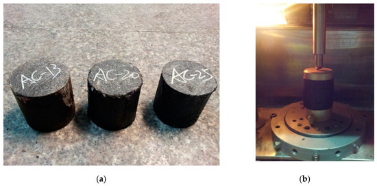 (a) The asphalt mastic specimens; (b) the uniaxial static creep test testing process.