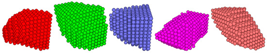 It has been proven that the geometry of coarse aggregates has a significant effect on the permanent deformation behavior of asphalt mixtures [28,29]. Therefore, the coarse aggregate geometry will directly determine the accuracy of the simulation results. In this paper, coarse aggregate was simplified as an irregular polyhedron. Random planes were used to cut a cube or a sphere to generate irregular polyhedral aggregates using a user-defined program. By traversing the regularly packed discrete elements, the positional relationship between the regular packing discrete elements and the irregular polyhedral aggregates could be evaluated. Discrete elements belonging to irregular polyhedral aggregate were regarded as aggregate elements, and were set as a clump, as seen in Figure 4. The original coarse aggregate balls were then deleted. Discrete elements outside the irregular polyhedron aggregate were considered as asphalt mastic. The initially developed 3D DE model of asphalt mixture is shown in Figure 5a.