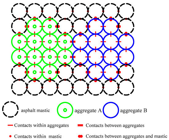 There are four types of contact within asphalt mixtures, including contacts between aggregate elements, contacts between adjacent aggregates, contacts between asphalt mastic elements, and contact between asphalt mastic and aggregates, as seen in Figure 6. In PFC3D, mesomechanical models are used to describe the contact behaviors between different components within asphalt mixtures. In this study, the mesomechanical models used in the model of asphalt mixtures included the stiffness model, slipping model, bonding model, and Burger’s model.