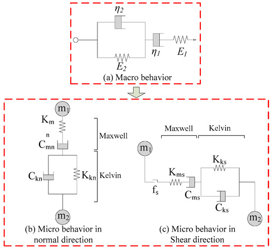 The contact behavior between aggregates and the asphalt mastic can be characterized by the equivalent meso Burger’s model, as shown in Figure 8. The equivalent meso model parameters can be obtained from the macro parameters of the aggregates and asphalt mastic, as expressed in Equations (5) and (6) [15,31]: