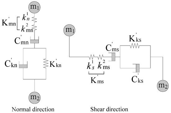 where K′mm, C′mm, K′kn, and C′kn are the parameters of the equivalent meso Burger’s model between the aggregates and mastic in the normal direction and K′ms, C′ms, K′ks, and C′ks are the parameters of the equivalent meso Burger’s model between the aggregates and the mastic in the shear direction.