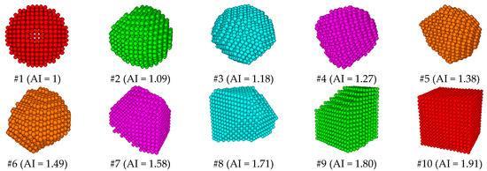 As mentioned above, irregular polyhedral aggregates were generated by cutting a cube or a sphere with random planes. Thus, the equivalent ellipsoid of an irregular polyhedral aggregate can be approximated to an equivalent sphere, and then Equation (8) can be further expressed as follows: