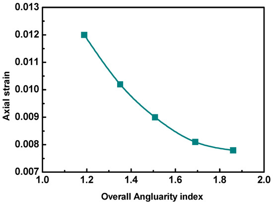 Simulations of uniaxial static creep tests were then conducted on the DE models of asphalt mixtures with different overall aggregate angularities. The results are shown in Figure 12. The permanent deformation performance of asphalt mixtures improved with the increasing aggregate angularity, but the improvement weakened gradually. The axial deformation of the asphalt mixture was the smallest when the aggregates were closest to a cube. This is consistent with the requirement of selecting aggregates with shapes close to a cube. Therefore, aggregates with good angularities should be selected to improve the permanent deformation resistance of asphalt pavement.