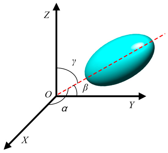 Previous studies about aggregate orientation have generally defined the long axis of the equivalent ellipse of aggregate in two dimensions as the long axis of aggregate, and used the angle between the long axis and the horizontal direction to represent the aggregate orientation [18,19,20,21]. In this study, the aggregate orientation was defined in three dimensions. The long axis of the equivalent ellipsoid of the aggregate was taken as the long axis, and the angles α, β, and γ between the long axis and X axis, Y axis, and Z axis were used to represent the aggregate orientation in three dimensions, as shown in Figure 13.
