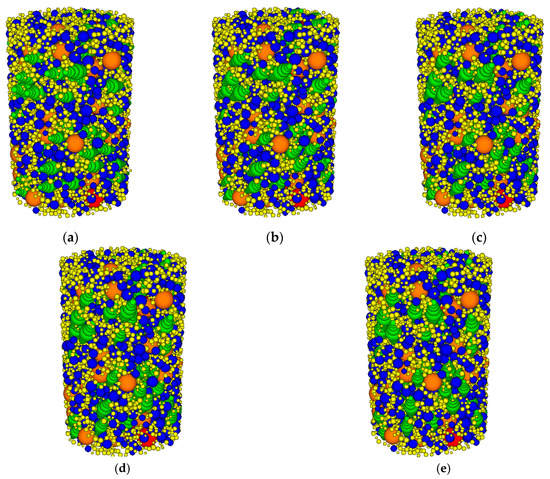Graded coarse aggregates with different orientations were generated and randomly put into the cylinder space of the asphalt mixture model. The unbalanced forces between the aggregates were eliminated by the “cycle” command, so that the coarse aggregates within the asphalt mixtures could reach equilibrium. The angular velocities of the coarse aggregates were fixed to keep the aggregate orientations constant during modeling.