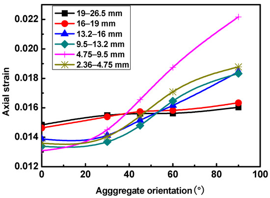 It can be seen from Figure 16 that the axial strains of the mixtures increased gradually with the increasing aggregate orientations. The orientations of 19–26.5mm and 16–19 mm aggregates had insignificant effects on the permanent deformation behavior of asphalt mixtures. The orientations of 13.2–16 mm, 9.5–13.2 mm, and 2.36–4.75 mm aggregates had more significant effects than those of 19–26.5 mm and 16–19 mm. The orientation of 4.75–9.5 mm aggregates had the greatest effect on the permanent deformation behavior of the asphalt mixtures. The reason is that the aggregates tended to rotate horizontally under vertical loads when the aggregate orientation was large. Thus, the aggregate skeleton was unstable and led to large axial deformation of the asphalt mixtures. When the aggregate orientation was closer to horizontal, the aggregate skeleton was more stable, and the axial deformation of the mixture specimens was smaller. It has been shown that the percentage pass of 4.75 mm plays an important role in controlling the aggregate skeleton, and the influence is next to that of air void content on the permanent deformation behavior of asphalt mixtures. This may be the reason why the orientation of 4.75–9.5 mm aggregates had such a great influence. Therefore, different kinds of rollers should be used during rolling compaction of asphalt pavement, which could force the aggregate orientation to be more horizontal. Thus, the asphalt pavement would reach a more stable state and its permanent deformation performance could be significantly improved.