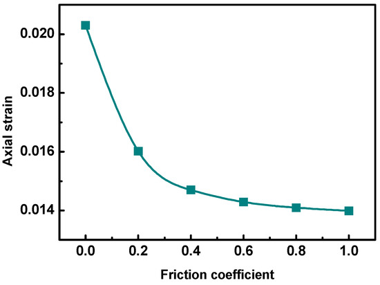 The surface texture of aggregates reflects the roughness of aggregate surface. The rougher the aggregate surface, the better the surface texture. Internal friction between aggregates and adhesion between aggregate and asphalt binder are closely related to the surface texture of aggregates. It has been proven that the surface texture of aggregates has a significant impact on the performance of asphalt mixtures, especially the permanent deformation performance. The randomly created irregular polyhedral aggregates in the DE model could only reflect geometry and angularity, without characterizing the surface texture of aggregates. In this study, the friction coefficient between aggregates was used to indirectly represent the surface texture of aggregates. The higher the friction coefficient, the rougher the surface texture. A series of DE models of asphalt mixture specimens with different aggregate friction coefficients assigned were developed. The internal structures of the developed DE models were the same, and only the aggregate friction coefficients of polyhedron aggregates in the DE models were different. Simulations of uniaxial static creep tests were conducted on the prepared DE models. The results are shown in Figure 17.