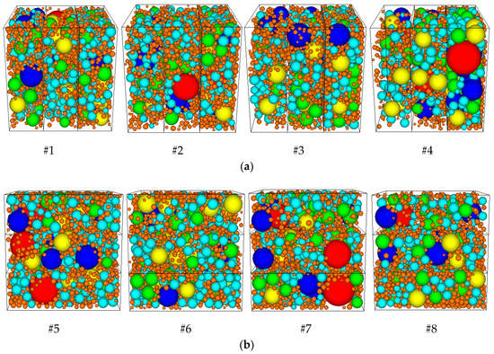 Aggregates distributed non-uniformly within DE models of asphalt mixtures: (a) aggregates distributed non-uniformly in the horizontal direction; (b) aggregates distributed non-uniformly in the vertical direction.