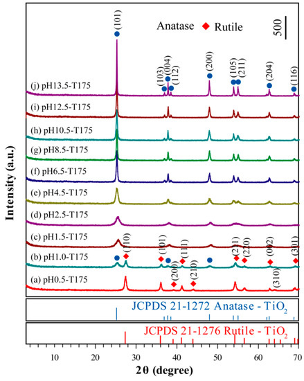 Figure 4 shows the XRD patterns of the typical samples at different pH values varying from 0.5 to 13.5. Apparently, for the pH0.5-T175 sample, the diffraction peaks (2θ values) of 27.42°, 36.06°, 38.29°, 41.24°, 44.12°, 54.30°, 56.56°, 62.82°, 64.00°, and 69.04°, could be assigned to (110), (101), (200), (111), (210), (211), (220), (002), (310), and (301) crystalline surfaces of the rutile TiO2 phase, respectively (JCPDS No. 21-1276, Figure 4a). With an increasing pH value in the suspension liquid, the pH1.0-T175 sample exhibited an anatase/rutile coexisting diffraction pattern, as shown in Figure 4b. The peaks at 2θ values of 27.40°, 36.04°, 41.28°, 54.34°, 56.70°, 62.88°, and 69.05° could be ascribed to (110), (101), (111), (211), (220), (002), and (301) crystalline surfaces of the rutile phase, respectively (JCPDS No. 21-1276), while other diffraction peaks at 25.46°, 37.82°, and 48.02° arose from the (101), (004), and (200) crystalline surfaces of the anatase TiO2 phase, respectively (JCPDS No. 21-1272). The mass fraction of anatase and the rutile contents present in the sample could be accurately obtained from the following equations [43]: